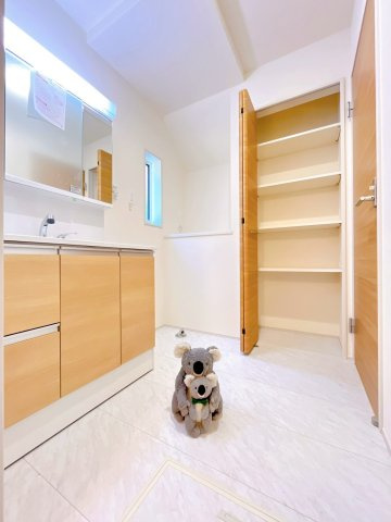 収納たっぷりな洗面脱衣室。洗濯機置き場横にはカウンターがあるので、作業台としてもお使いいただけます。